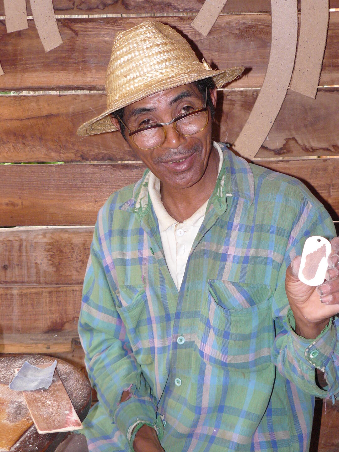 selbstgebastelten Laubsäge sägt er feinste Figuren, Palmen, Bäume,