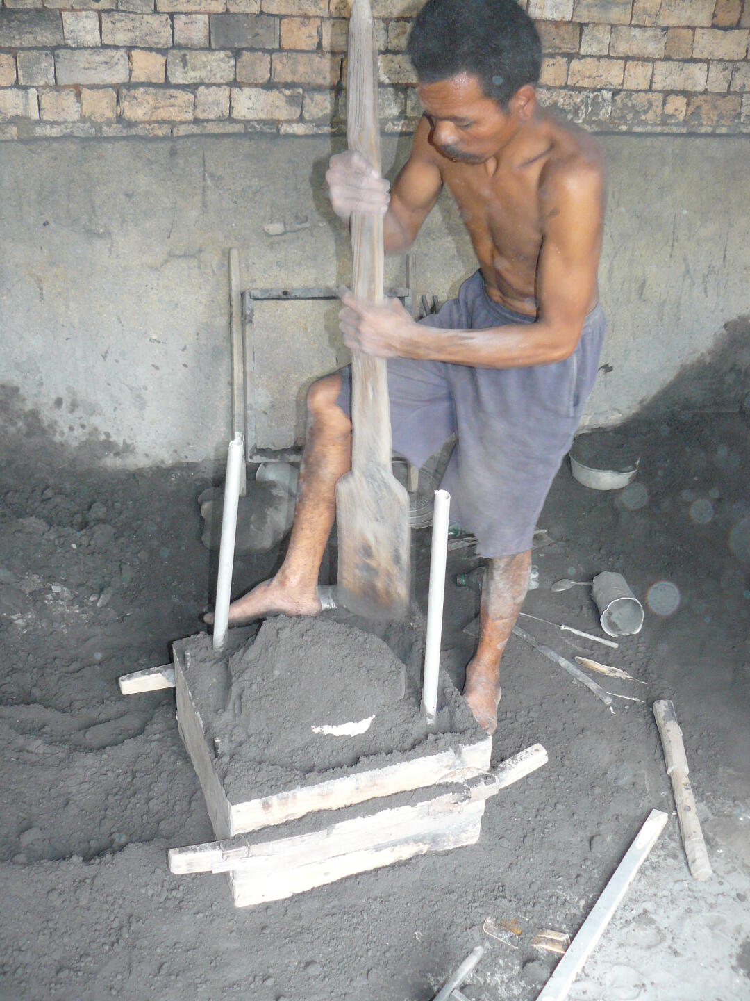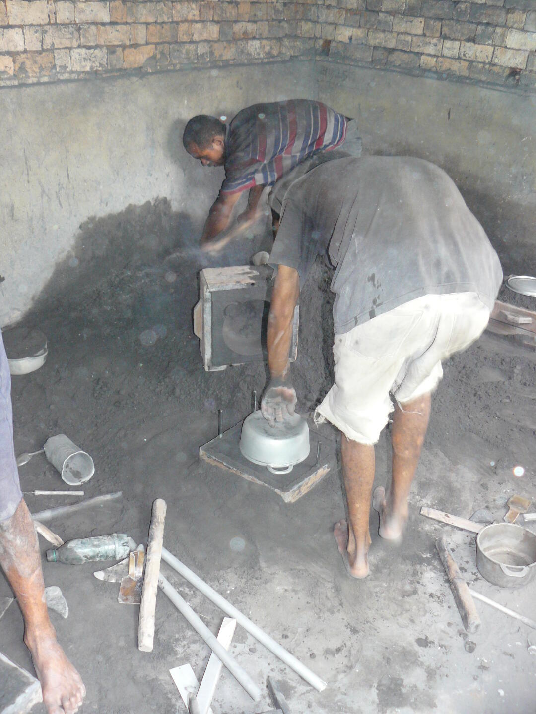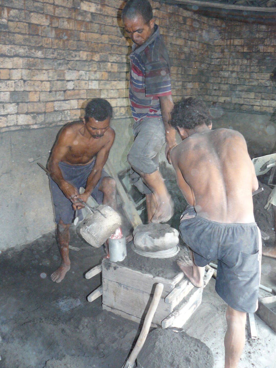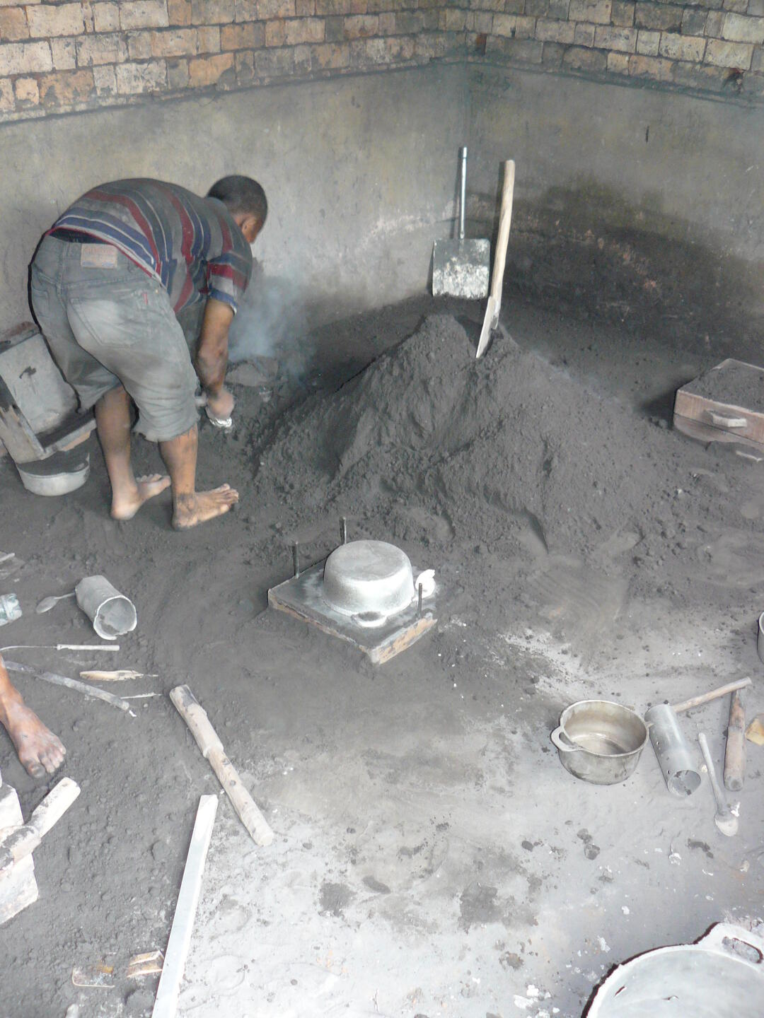 Löcher wird das flüssige Aluminium hineingeschüttet. Anschließend wird der fertige Topf ausgebuddelt, und