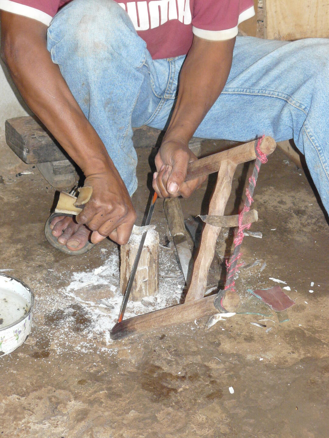 herausfällt. Anschließend wird mit einer Säge und einer Art Beil die