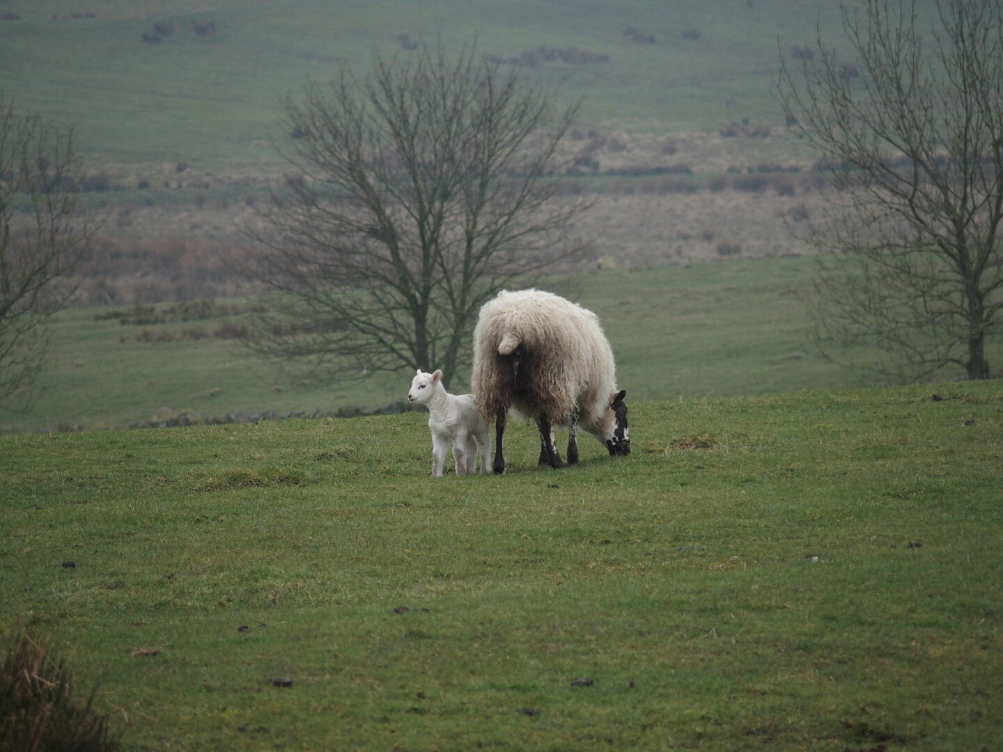 None of the hamlets or small collections of houses that we passed had a tea room. Instead, we enjoyed a rich display of wild and not so wild life: pheasants, sheep, lambs, cattle, crows, gulls, and military helicopters. When we came across a sign pointing to Lancerost priory, which is supposedly worth a visit, we started to walk in that direction, but then decided that we had enough walking to do without this detour, and besides, it might have been closed anyway. When we finally reached a village with a tea room (Walton), it was 10 minutes before closing time. We passed some of the places we had called in the morning in search of a room. Surprisingly, many had been booked or had been unwilling to take on guests for other reasons. So we had to leave the Hadrian's Wall Path again in Newtown and walk another 1.5 km to Irthington, where we had a room in the Vallum Barn farmhouse. I cannot stop to marvel over the beauty and cosiness of the English Bed an Breakfasts. Our room was warm and welcoming, and there was a lounge or dining room for us to sit and enjoy the tea and cookies that the landlady prepared for us. Then she phoned the pub to make sure we would get a table for our dinner. The house was part of a larger complex of farm buildings that were built around a central courtyard. Our room had windows in three directions and allowed us to survey the courtyard as well as a small garden full of daffodils and two horses.