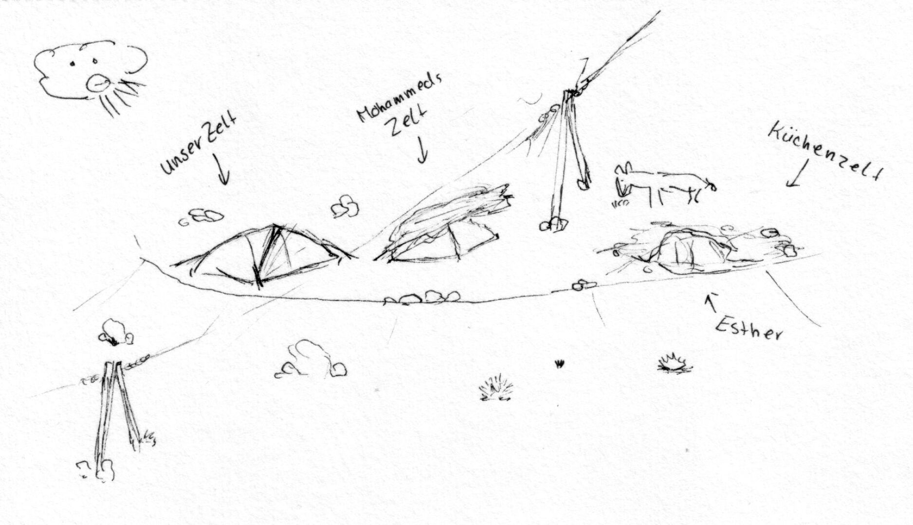 Endlich kommt das Küchenzelt zum Einsatz. Im Hintergrund Mohameds und unser Zelt.