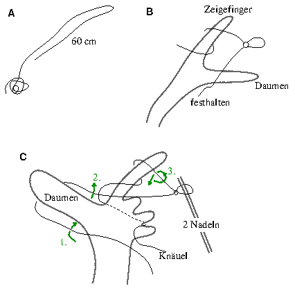 Figure 1: 60 cm is 23.6 inches. The thick grey line is supposed to be your left hand. 'Zeigefinger' = index finger, 'Daumen' = Thumb. 'festhalten' = hold on, 'Nadeln' = needles, 'Knäuel' = ball of wool.