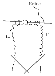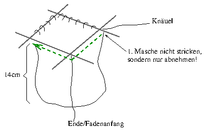 Figure 4: 14cm is 5.5 inches. 'Ende/Fadenanfang' = end/beginning of thread (where you started knitting). Small arrow says: "Don't knit first stitch, only take it off."