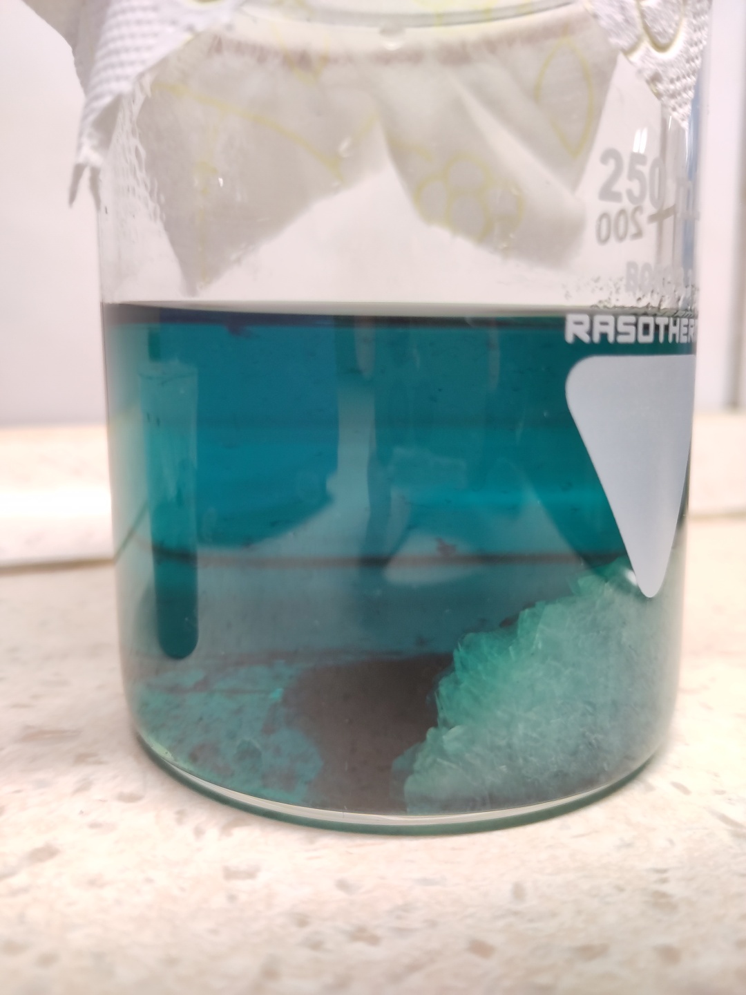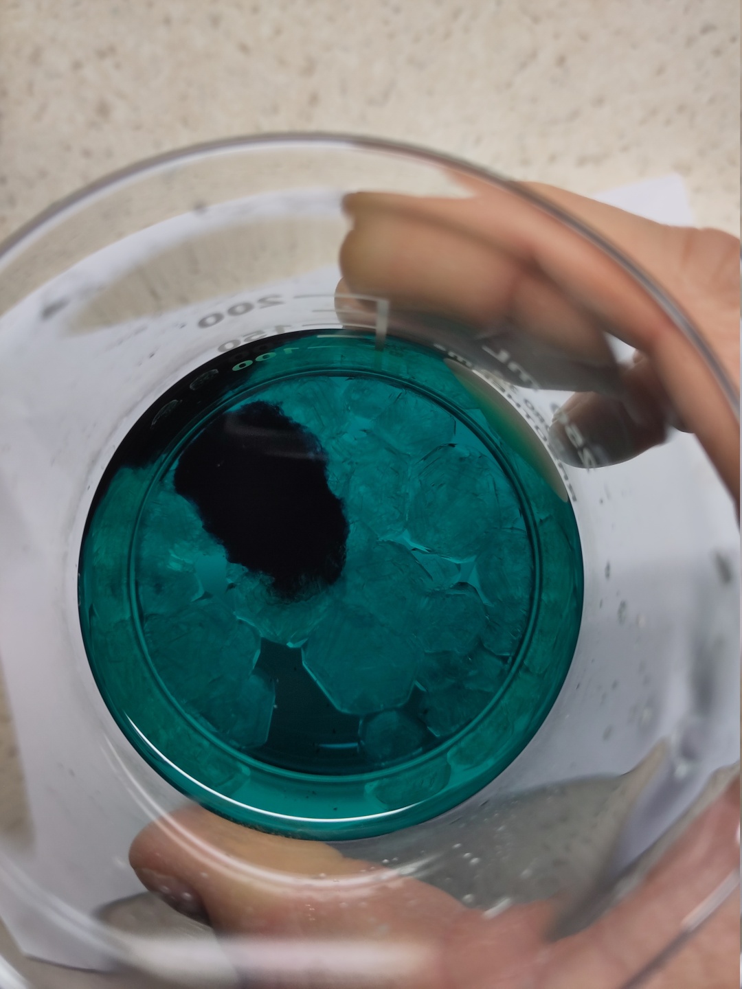 Und am nächsten Morgen wundern, dass es nicht so aussieht, wie in der Anleitung beschrieben. Statt einzelner Kristalle hat sich ein großer, unordentlicher Kristallblock gebildet. Die Farbe ist nicht mehr gleichmäßig in der Flüssigkeit verteilt, geschweige denn in demj Kristall. Es hat sich wie in einer Lavalampe ein Blop aus dunkler Flüssigkeit von der helleren Salzlösung getrennt. Wenn man mit dem Spatel umrührt, bilden sich flockige Schlieren.
