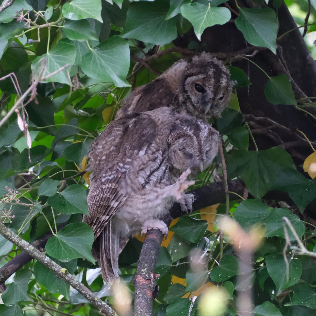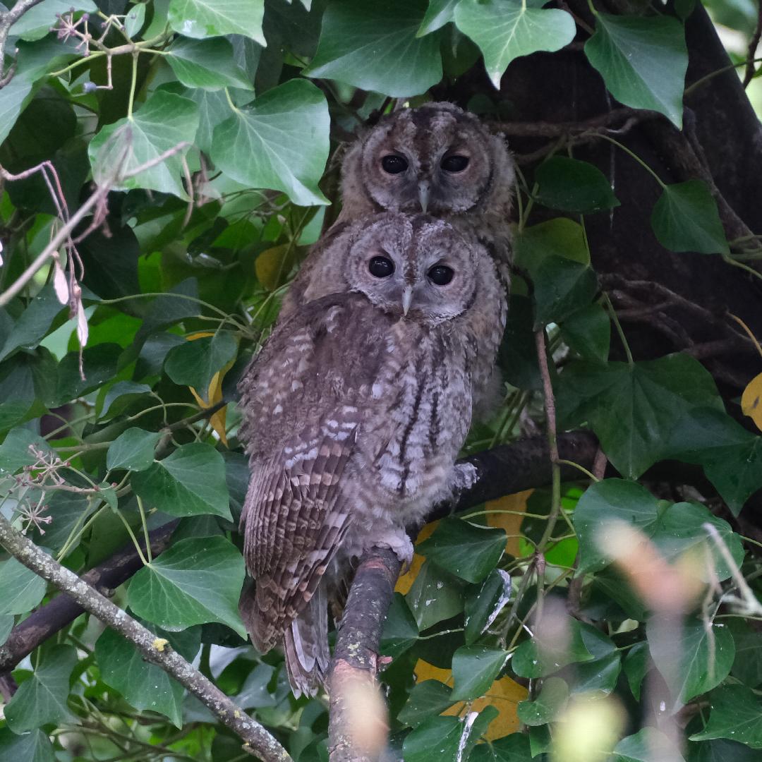 Die Waldkäuze, die vor ein paar Jahren ihre fünf Jungen direkt vor unserem Balkon aufgezogen haben, sind zurück! Bisher konnten wir nur zwei Jungtiere und einen Altvogel sehen. Dem Geräusch nach sind es eher mehr