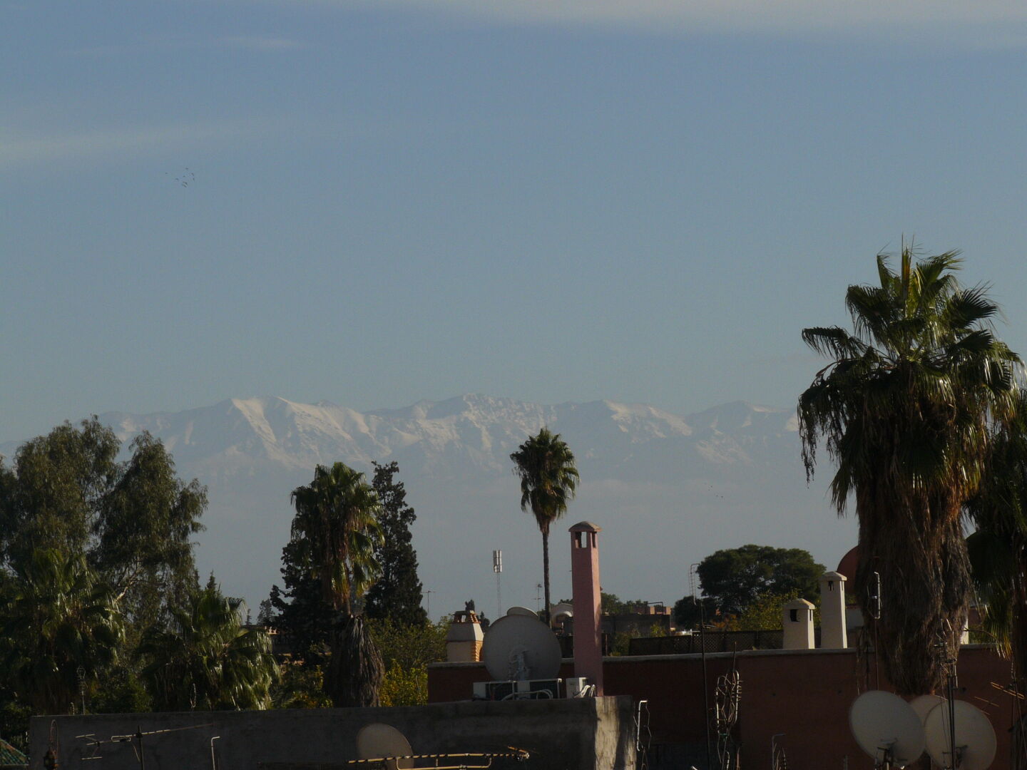 Noch weiter südlich sollen laut Stadtplan die Gärten sein. Der Eingang ist scheinbar irgendwo auf derSüdseite. Die Gärten sind riesig. Ich laufe erst an der Nordseite entlang, dann im Osten, dann fast die ganze Südseite. Schließlich sehe ich ein paar uniformierte Wachleute und frage nach dem Eingang. Ja, der sei genau hier, aber die Gärten seien heute geschlossen... Mist. Also in der heißen Mittagssonne weiter, an der Westseite entlang wieder nach Norden, Richtung Stadtzentrum. Ein paar Pausen für Datteln und Wasser sind angesagt. Nach einer Ewigkeit erreiche ich wieder die Stadtmauer beim Stadttor Bab Robb, und bald darauf die Straße vor dem Hotel Afriquia. Ein Imbiß lädt zum verspäteten Mittagessen mit Cola und Sanwich Charawma (=Gyros) ein. Dann zurück ins Hotel, auf der Dachterasse faulenzen und die Fernsicht genießen. Endlich sieht man mal die schneebedeckten Berge des Hohen Atlas in der Ferne. Die Sonne wärmt noch schön, und die Kacheln haben sowieso die Wärme des Tages gespeichert. In der Abendsonne sollen die Berge besonders schön sein, aber bis dahin sind wieder Wolken aufgezogen.