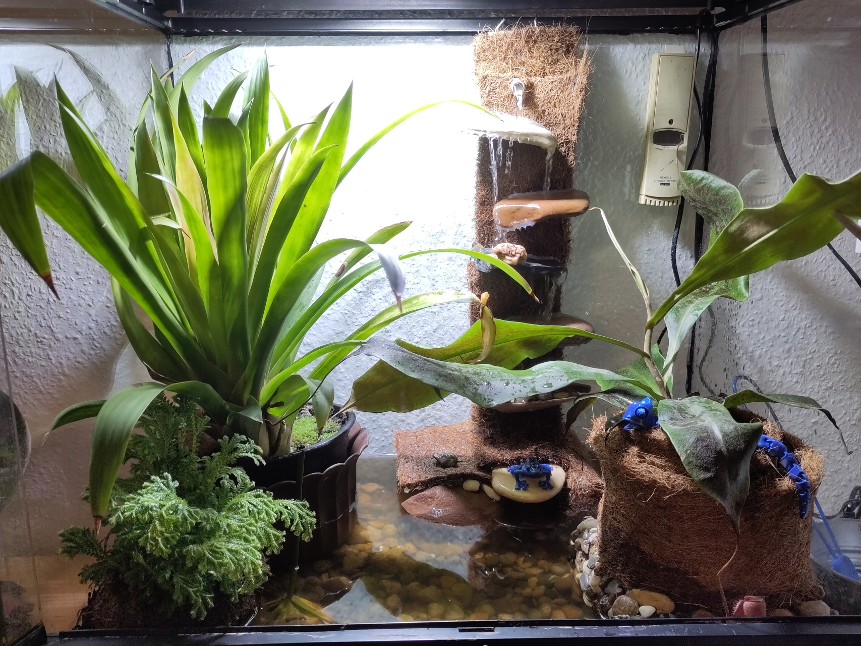 Ich habe ein neues Projekt: ein Paludarium. Das ist ein Terrarium mit Wasser drin. Meine ursprüngliche Idee war, eine Umgebung mit hoher Luftfeuchtigkeit für die Kannenpflanze und die Bromelie zu schaffen. Deswegen habe ich auch gleich einen kleinen Wasserfall mit eingebaut, in der Hoffnung, dass das plätschernde Wasser besser verdunstet.