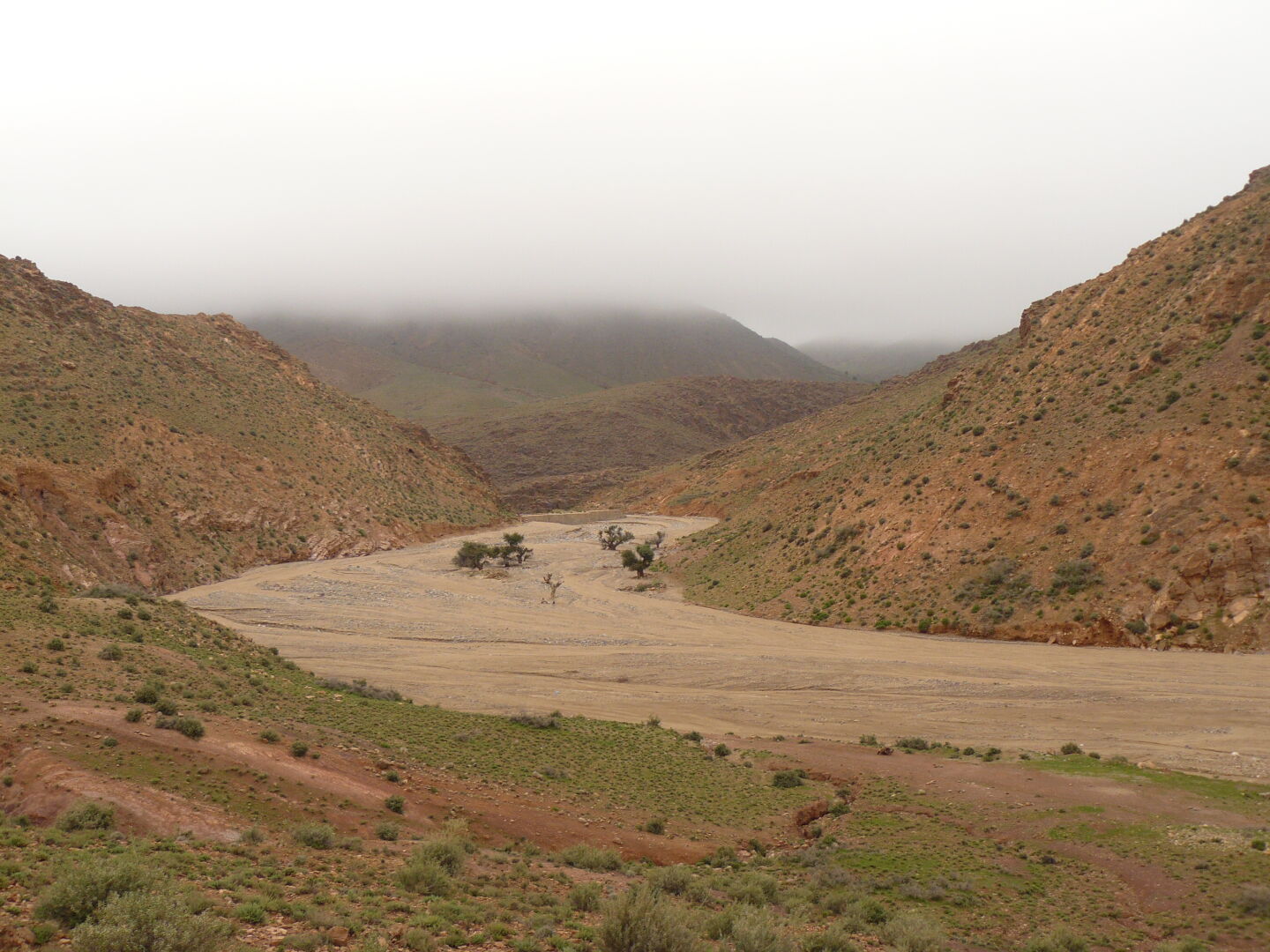 Das Wetter ist bedeckt und diesig, die Gipfel und Grate um uns herum sind in den Wolken. Dennoch ist die Landschaft sehr schön. Wir sehen eine ganze Weile keine anderen Menschen und schließlich verschwindet auch die Stromleitung, die uns bisher begleitet hat. Ein Stück geht's wieder im Flußtal entlang. Kurze Pause unter einem Pistazienbaum. Die frischen Datteln sind wirlich lecker, dennoch wird es eine Herausforderung werden, alle bis zum Ende der Tour aufzuessen.