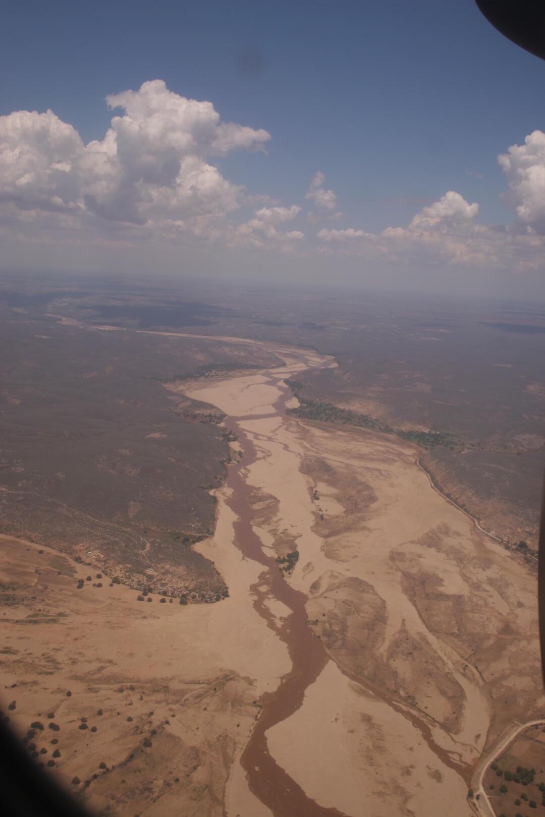 paag einzelnen Bäumen, kahle Felder. Wir sehen ein paar Flüsse, die
