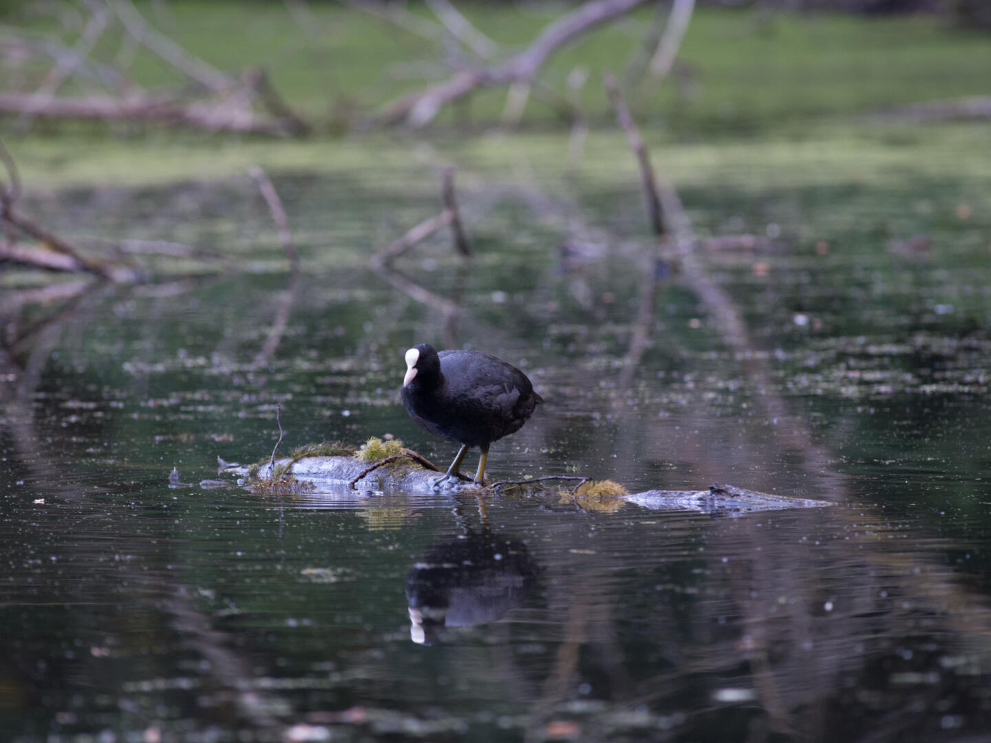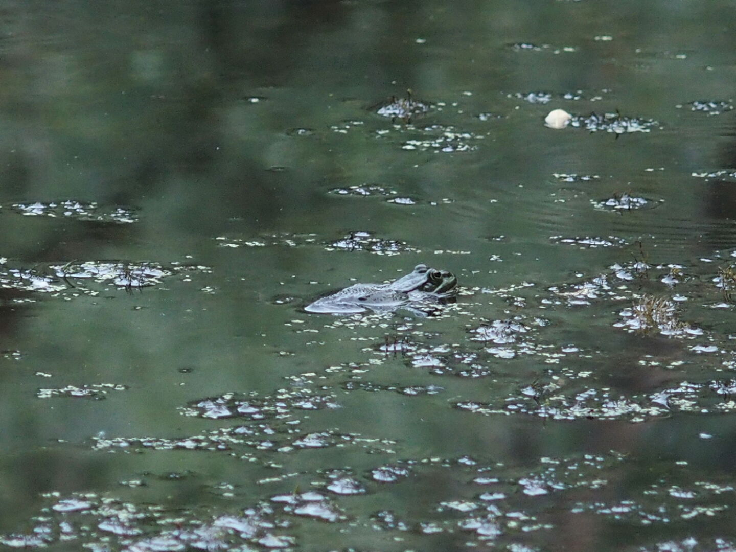 Ich hatte schon befürchtet, daß durch die ganze Unruhe nun keine Tiere mehr zu sehen sein würden, habe mich aber getäuscht. Ich suche mir erst mal ein ruhiges Plätzchen am Ufer. Leises Platschen empfängt mich – Frösche, die durch mein Erscheinen aufgeschreckt wurden und schnell untertauchen. Ich mache es mir bequem und legeFernglas und Kamera bereit. Der Teich ist ziemlich klein, vielleicht 10, 15 Meter breit und 30 Meter lang, und die Oberfläche voller Algen und Wasserpflanzen. Am gegenüberliegenden Ufer, oder vielleicht ist das auch eine große Insel, liegen umgestürzte Bäume. Auf dem Teich sind eine Menge Teichhühner unterwegs. In einiger Entfernung, auf einem Ast im Wasser, gibt es ein Nest, aber das ist leer – die Familie ist noch unterwegs. Die jungen Teichhühner sind schon ziemlich groß, lassen sich aber von den Altvögeln durch ihr graues Gefieder und den hellen Fleck auf der Brust leicht unterscheiden. Nach einiger Zeit tauchen die Frösche wieder auf, rund um mich her höre ich es plätschern und sehe die Kringel von sich bewegendem Getier im Wasser. Die Frösche selbst zu sehen ist wegen der vielen Wasserpflanzen schwierig. Bald beginnt es hier und da zu quaken. Es ist ein ganz schöner Lärm! Ich kann die Frösche beobachten, wie sie zu mehreren um die Wette quaken. Bald darauf ist es wieder ganz leise. So geht es den ganzen Abend über.