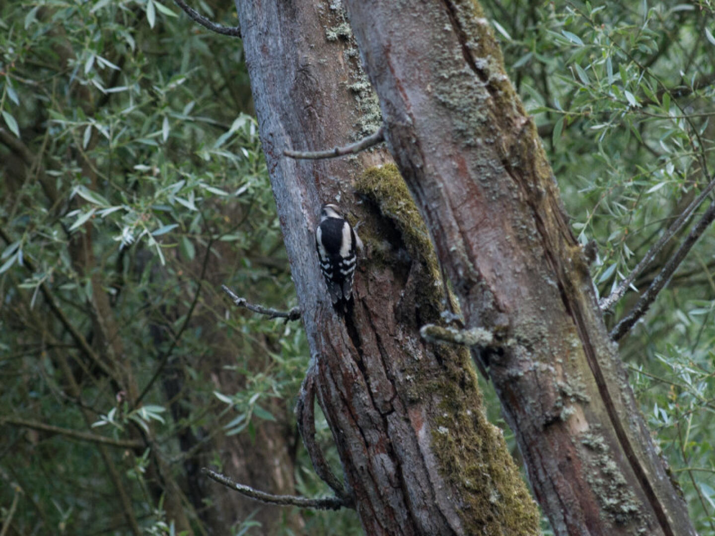 Ein Klopfen, und ein paar schrille Schreie: Buntspechte! Dank des Fenrglases kann ich sie an einem toten Baumstamm beobachten. Sie hupfen um den Stamm herum und untersuchen die Löcher auf Nahrung.