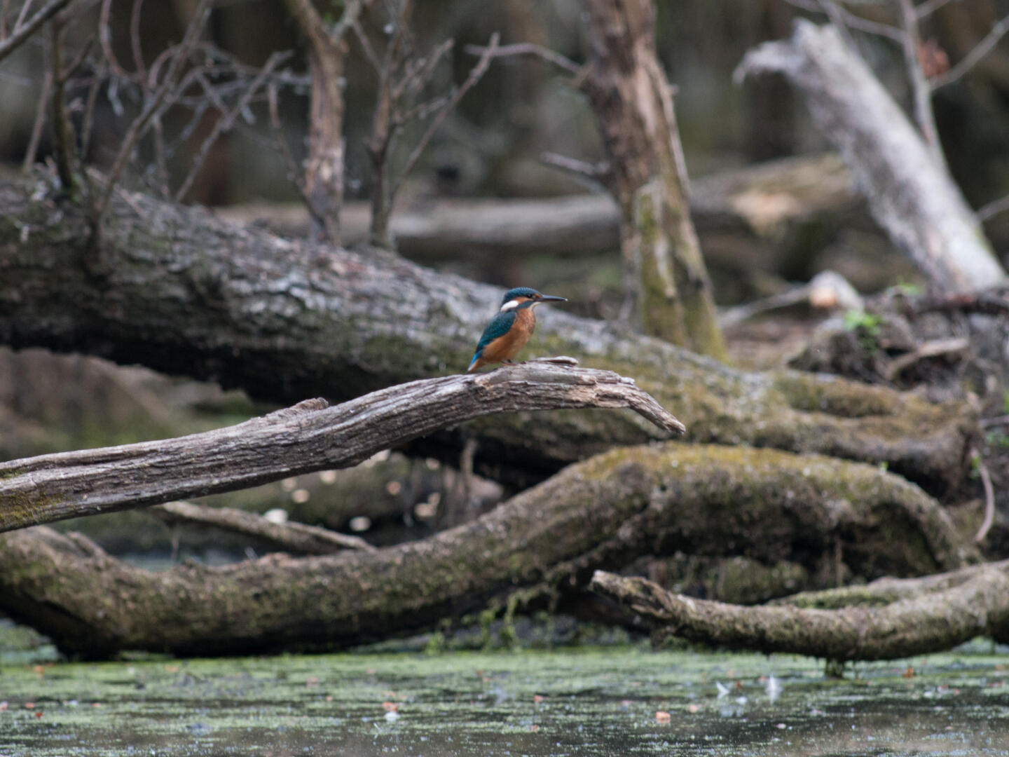 Auf einmal ein leuchtend blauer Fleck gegenüber — ein Eisvogel! Er sitzt da direkt vor meiner Nase auf einem dünnen Ast über der Wasseroberfläche und wartet auf Beute. Gelegentlich stürzt er sich ins Wasser, fängt etwas und kehrt auf seinen Ast zurück. Ab und zu fliegt er ein Stück weiter auf den nächsten Ast.