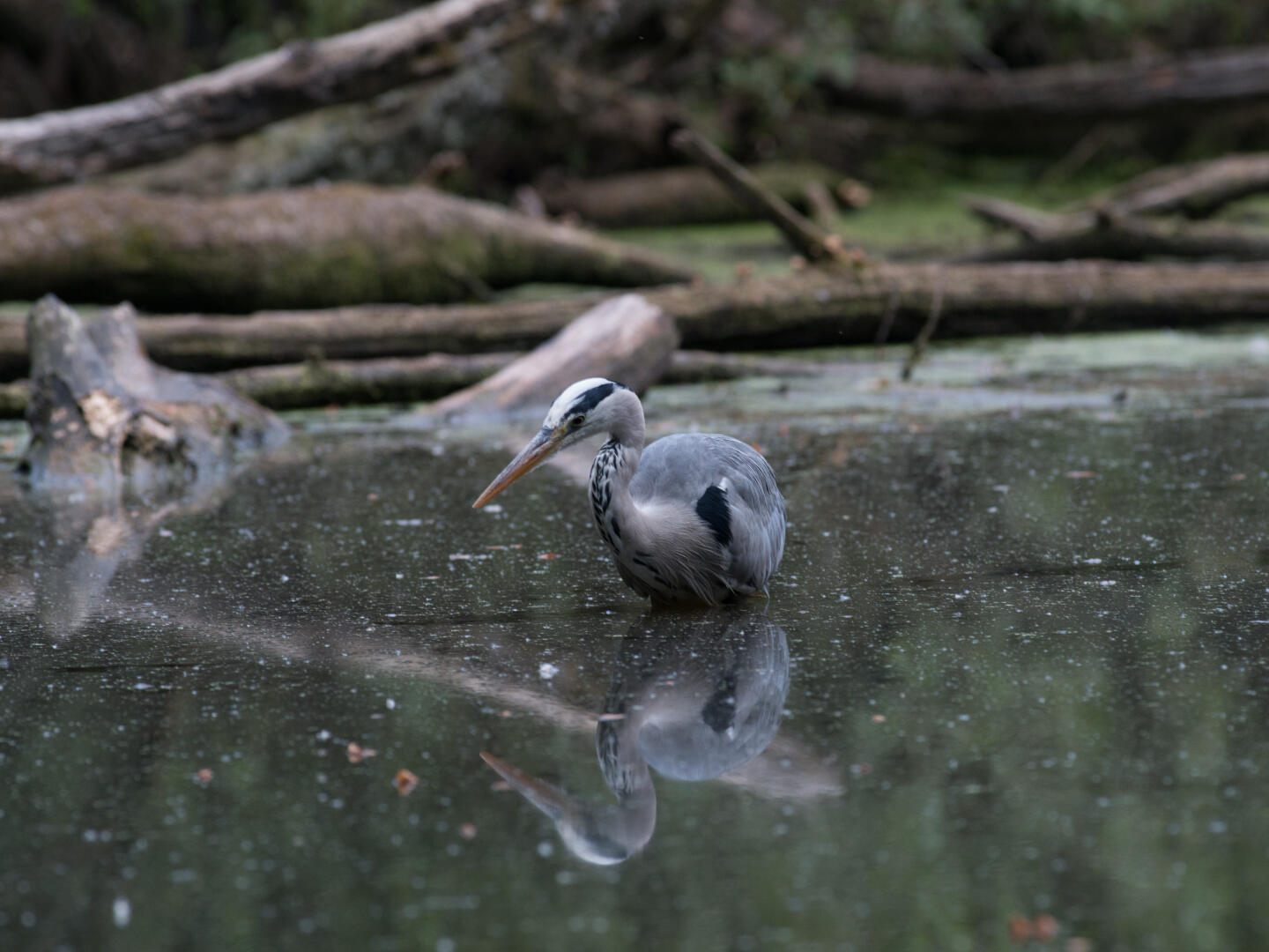 Ein Reiher kommt herangeflogen und landet im Wasser. Die Biberratte läßt sich von ihm nicht stören. Der Reiher steht bis zum Bauch im Wasser und stakt herum, langsam einen Fuß vor den anderen setzend, den langen Hals in eine Schlaufe gelegt und den Schnabel vorgestreckt. Blitzartig schnellt sein Kopf nach vorn ins Wasser, man sieht es eigentlich erst, als er den Kopf schon wieder heraus hat und am Schlucken ist. Ulkig ist es, zu beobachten, wie er über einen im Wasser liegenden Baumstamm klettert. Er ist nicht gelenkig genug, seinen langen Fuß vollständig über den Stamm und auf der anderen Seite wieder ins Wasser zu setzen. Also stellt er den Fuß auf den Stamm und flattert mit den Flügeln, bis er ganz auf dem Stamm steht (so sieht das bei mir aus, wenn ich beim Klettern auf einen Tritt steigen will, der etwa zu weit oben liegt), und dann setzt er blitzschnell den anderen Fuß auf der anderen Seite wieder ins Wasser und zieht den ersten Fuß dann nach, wobei er nochmal flattern muß, damit er den Bauch so hoch kriegt, daß er den Fuß darunter hervorziehen kann.